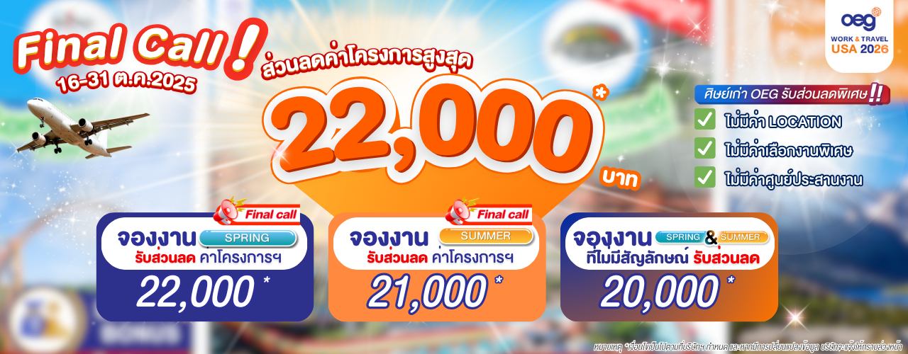 โปรโมชันสำหรับนักศึกษาศิษย์เก่า OEG ทุกโครงการ ทั้ง Work and Travel USA และ High School Exchange ที่เข้าร่วมโครงการจนสิ้นสุดโครงการฯ โดยสมบูรณ์ โดยจะต้องลงทะเบียนยืนยันสถานะ 👉คลิกที่นี่